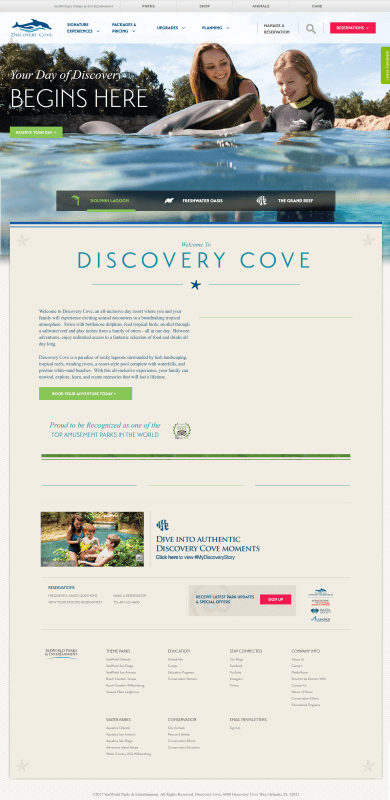The redesign of the Discovery Cove responsive site included the full desktop, tablet, and mobile experience. Robust current state and competitive analysis informed the design process, and usability testing of a prototype allowed the design team to evaluate and refine the booking experience.
